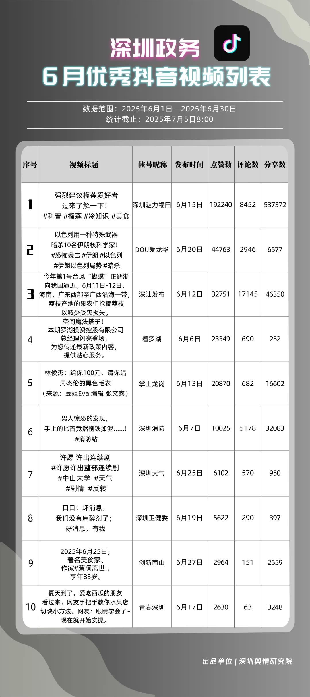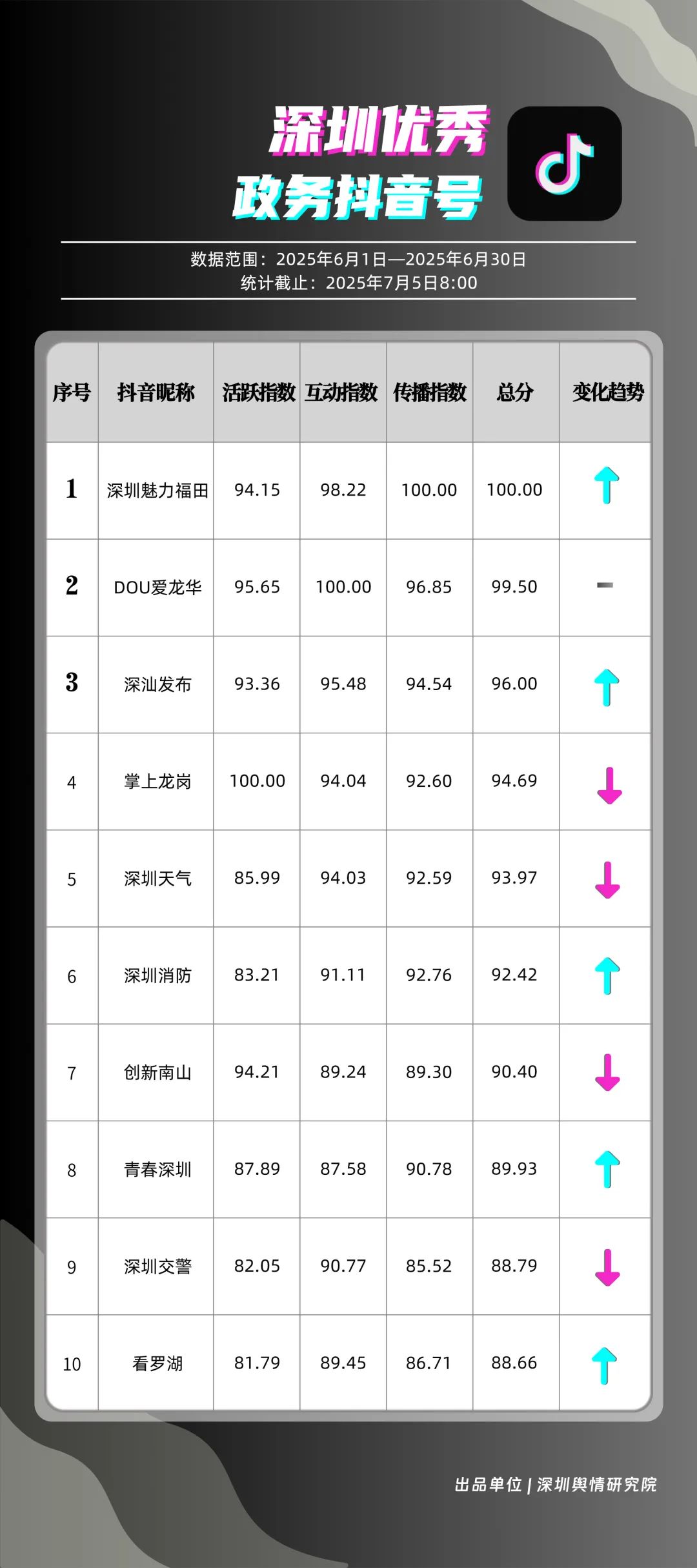 6月,“深圳魅力福田”“DOU愛龍華”“深汕發(fā)布”“掌上龍崗”“深圳天氣”“深圳消防”“創(chuàng)新南山”“青春深圳”“深圳交警”“看羅湖”共10個政務(wù)抖音號獲得“優(yōu)秀政務(wù)抖音號”稱號。6月,“深圳魅力福田”登頂,憑借其城市人文、社會熱點類主題短視頻,在傳播指數(shù)得分創(chuàng)新高;“DOU愛龍華”“深汕發(fā)布”“掌上龍崗”緊隨其后,通過各類熱點、創(chuàng)意內(nèi)容提升傳播效能。“深圳天氣”“深圳消防”也表現(xiàn)突出,短視頻內(nèi)容兼具“信息傳遞”與“情感共鳴”,用戶參與度持續(xù)提升,不斷為網(wǎng)民傳播有價值的政務(wù)信息資訊。
