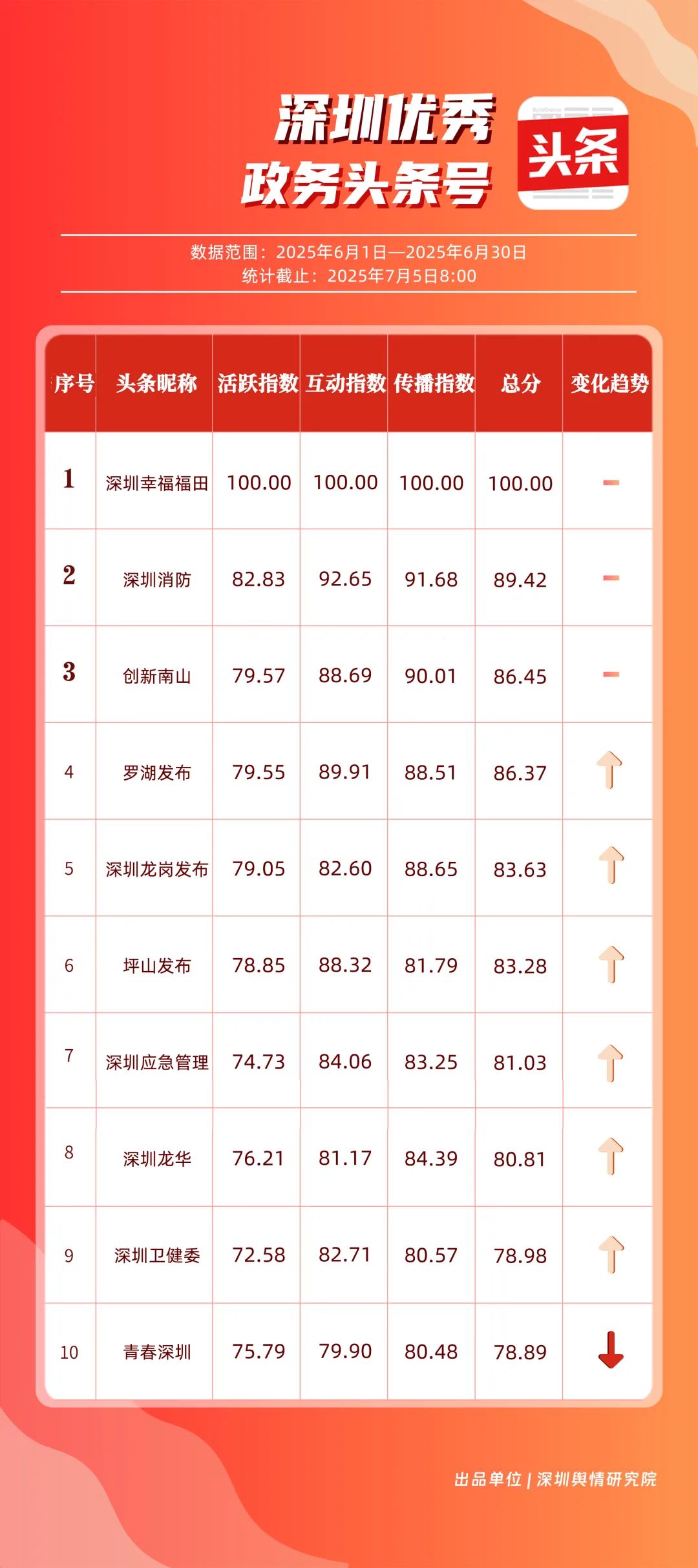 6月,“深圳幸福福田”“深圳消防”“創(chuàng)新南山”“羅湖發(fā)布”“深圳龍崗發(fā)布”“坪山發(fā)布”“深圳應(yīng)急管理”“深圳龍華”“深圳衛(wèi)健委”“青春深圳”共10個政務(wù)頭條號入選“優(yōu)秀政務(wù)頭條號”榜單?!吧钲谛腋8L铩薄吧钲谙馈薄皠?chuàng)新南山”連續(xù)位居榜單前3名,內(nèi)容具備較強(qiáng)的吸引力?!傲_湖發(fā)布”“深圳龍崗發(fā)布”排名也在榜單前列,排名較5月有所上升,在區(qū)域形象宣傳與民生服務(wù)中持續(xù)發(fā)力。