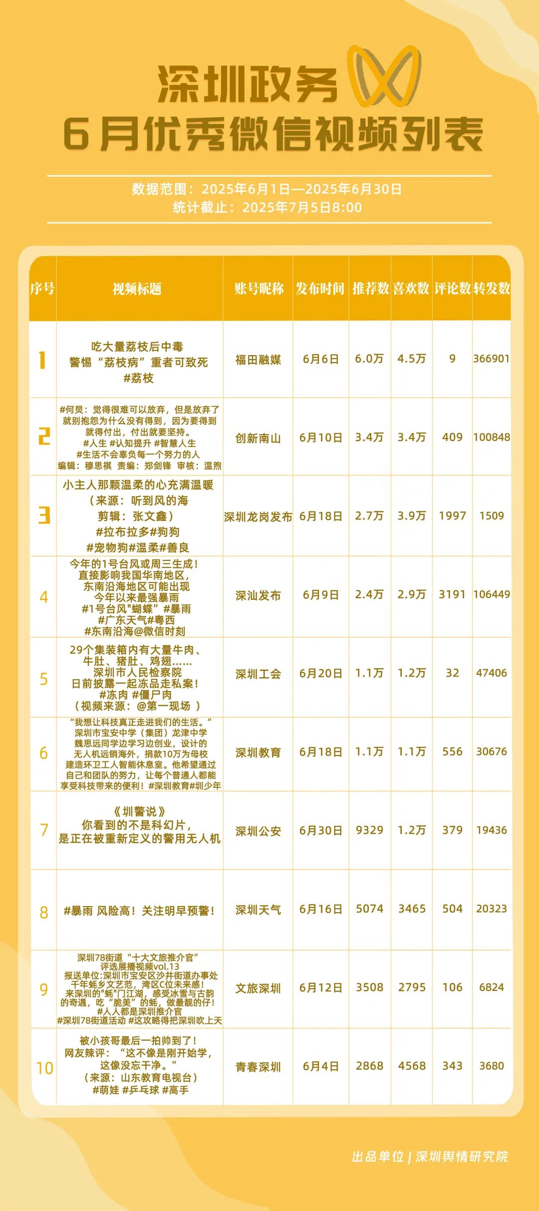 6月,獲得“深圳優(yōu)秀政務(wù)微信視頻號”稱號的是“福田融媒”“深汕發(fā)布”“深圳龍崗發(fā)布”“創(chuàng)新南山”“深圳教育”“深圳天氣”“青春深圳”“深圳公安”“文旅深圳”“深圳應(yīng)急管理”。其中,“福田融媒”以活躍、傳播指數(shù)雙滿分居榜首,其視頻《吃大量荔枝后中毒 警惕“荔枝病”重者可致死》獲得超36萬次轉(zhuǎn)發(fā),成為爆款案例;“深汕發(fā)布”“深圳龍崗發(fā)布”“創(chuàng)新南山”得分在90分以上,在互動、傳播方面表現(xiàn)亮眼。這些優(yōu)秀的政務(wù)微信視頻號以各自的獨特風(fēng)格持續(xù)發(fā)力,為政務(wù)及民生信息傳遞開拓更鮮活、暢通的路徑。
