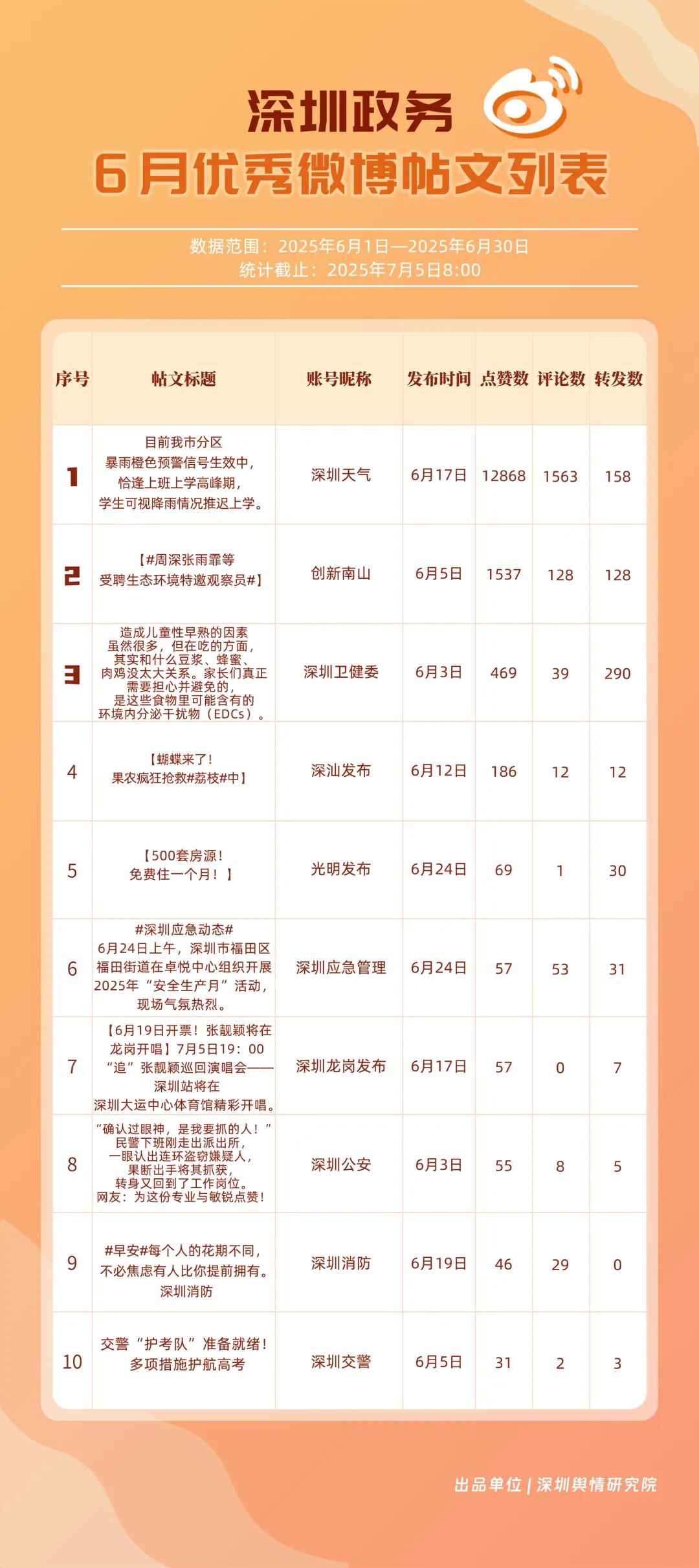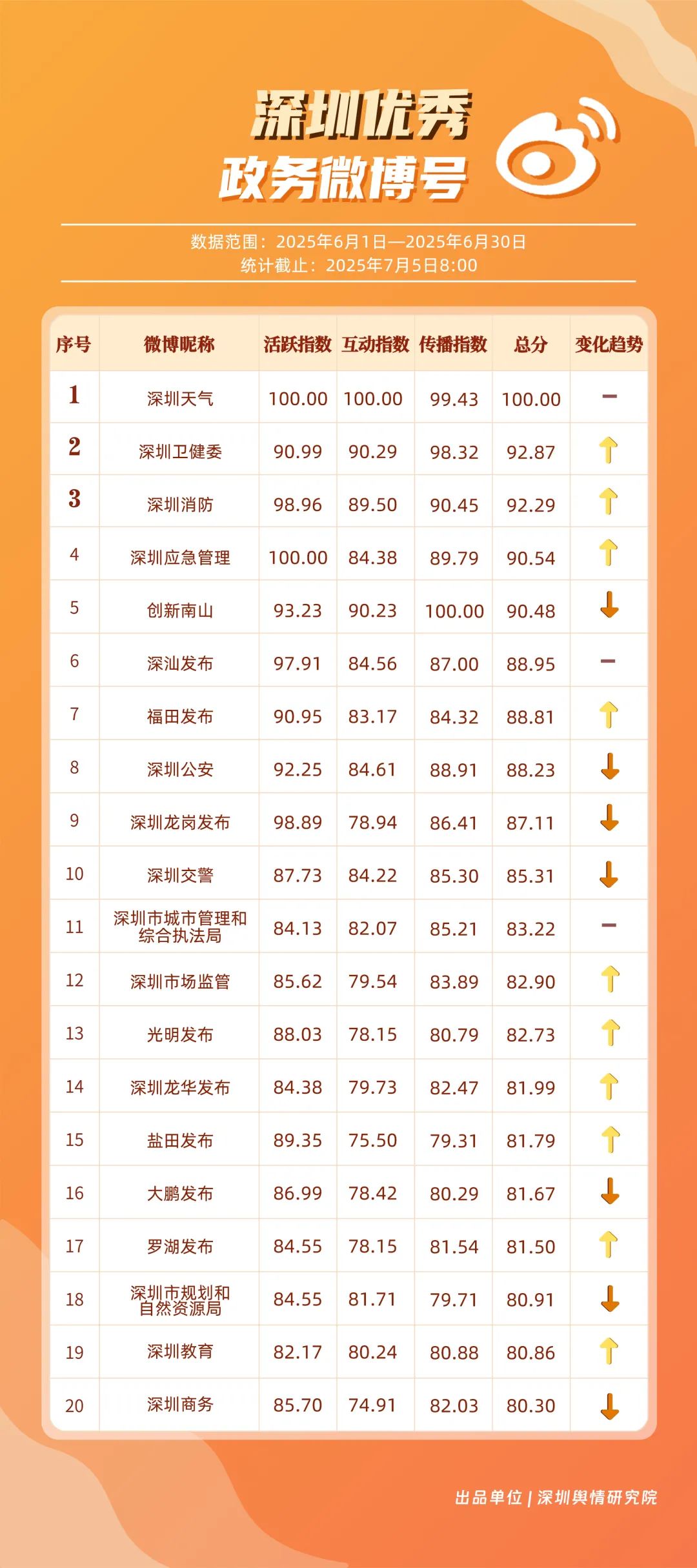 6月,“深圳天氣”“深圳衛(wèi)健委”“深圳消防”“深圳應(yīng)急管理”“創(chuàng)新南山”“深汕發(fā)布”“福田發(fā)布”“深圳公安”“深圳龍崗發(fā)布”“深圳交警”等20個賬號入選“優(yōu)秀政務(wù)微博號”。其中,“深圳天氣”以活躍、互動指數(shù)雙滿分穩(wěn)居第一,氣象服務(wù)信息及時性與科普內(nèi)容趣味性獲市民高度認(rèn)可;“深圳衛(wèi)健委”“深圳消防”“深圳應(yīng)急管理”分別位列2至4位,通過熱點話題聯(lián)動醫(yī)療、消防、應(yīng)急知識科普擴(kuò)大影響力,政務(wù)微博矩陣在突發(fā)事件響應(yīng)與民生服務(wù)中作用凸顯。