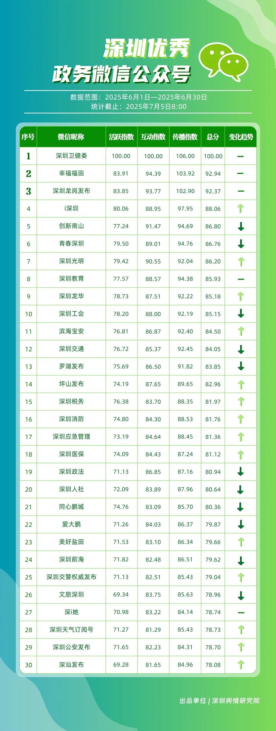 6月,30個政務(wù)微信公眾號入選“深圳優(yōu)秀政務(wù)微信公眾號”榜單,其中包括“深圳衛(wèi)健委”“幸福福田”“深圳龍崗發(fā)布”“i深圳”“創(chuàng)新南山”“青春深圳”“深圳光明”“深圳教育”“深圳龍華”“深圳工會”等。6月,榜單前三名的賬號保持穩(wěn)定,且各創(chuàng)作出多篇閱讀量超10萬次的優(yōu)質(zhì)文章,傳播指數(shù)得分均在100分以上?!吧钲谛l(wèi)健委”持續(xù)位居榜首,內(nèi)容專業(yè)性與傳播力持續(xù)領(lǐng)跑;“幸福福田”以92.94分位居第二,得分較5月有所提高。“深圳龍崗發(fā)布”“i深圳”“創(chuàng)新南山”也積極發(fā)布民生服務(wù)與宣傳活動內(nèi)容,排名靠前。上榜賬號整體呈現(xiàn)“內(nèi)容精品化、服務(wù)場景化”特點,持續(xù)優(yōu)化信息供給質(zhì)量,為用戶打造有深度的政務(wù)信息服務(wù)矩陣。