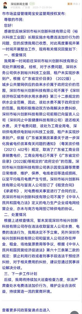 感謝您反映深圳市裕興創(chuàng)新科技有限公司(裕興科技工業(yè)園)長期實施水電費違法加價行為的問題,您的反饋我局已收悉,對此高度重視并第一時間開展整治工作,現(xiàn)將有關(guān)情況回復如下: