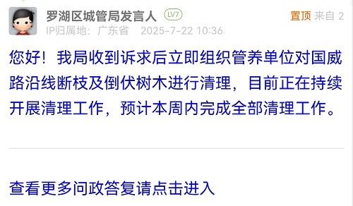 您好!我局收到訴求后立即組織管養(yǎng)單位對國威路沿線斷枝及倒伏樹木進行清理,目前正在持續(xù)開展清理工作,預計本周內(nèi)完成全部清理工作。