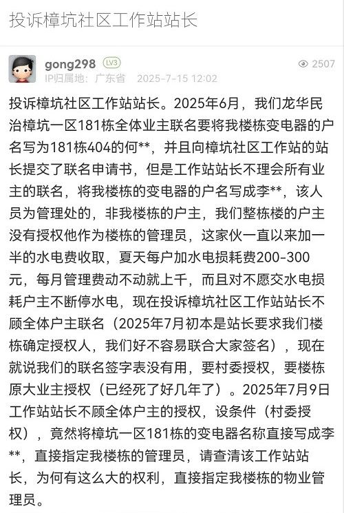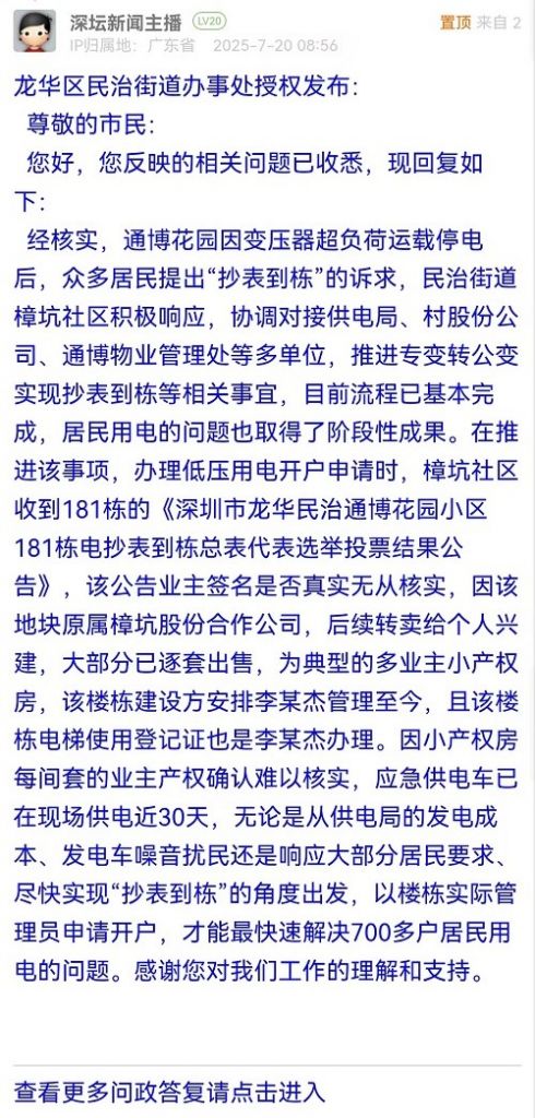 經(jīng)核實,通博花園因變壓器超負荷運載停電后,眾多居民提出“抄表到棟”的訴求,民治街道樟坑社區(qū)積極響應,協(xié)調(diào)對接供電局、村股份公司、通博物業(yè)管理處等多單位,推進專變轉(zhuǎn)公變實現(xiàn)抄表到棟等相關(guān)事宜,目前流程已基本完成,居民用電的問題也取得了階段性成果。在推進該事項,辦理低壓用電開戶申請時,樟坑社區(qū)收到181棟的《深圳市龍華民治通博花園小區(qū)181棟電抄表到棟總表代表選舉投票結(jié)果公告》,該公告業(yè)主簽名是否真實無從核實,因該地塊原屬樟坑股份合作公司,后續(xù)轉(zhuǎn)賣給個人興建,大部分已逐套出售,為典型的多業(yè)主小產(chǎn)權(quán)房,該樓棟建設方安排李某杰管理至今,且該樓棟電梯使用登記證也是李某杰辦理。因小產(chǎn)權(quán)房每間套的業(yè)主產(chǎn)權(quán)確認難以核實,應急供電車已在現(xiàn)場供電近30天,無論是從供電局的發(fā)電成本、發(fā)電車噪音擾民還是響應大部分居民要求、盡快實現(xiàn)“抄表到棟”的角度出發(fā),以樓棟實際管理員申請開戶,才能最快速解決700多戶居民用電的問題。感謝您對我們工作的理解和支持。