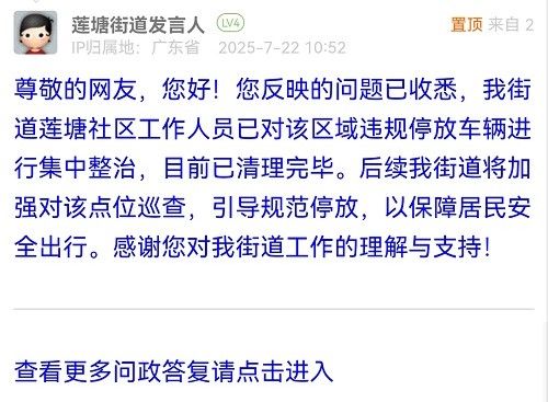 尊敬的網(wǎng)友,您好!您反映的問題已收悉,我街道蓮塘社區(qū)工作人員已對該區(qū)域違規(guī)停放車輛進行集中整治,目前已清理完畢。后續(xù)我街道將加強對該點位巡查,引導規(guī)范停放,以保障居民安全出行。感謝您對我街道工作的理解與支持!
