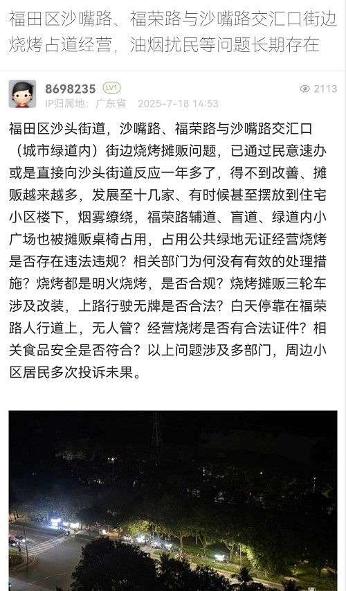 22. 帖文《福田區(qū)沙嘴路、福榮路與沙嘴路交匯口街邊燒烤占道經(jīng)營,油煙擾民等問題長期存在》