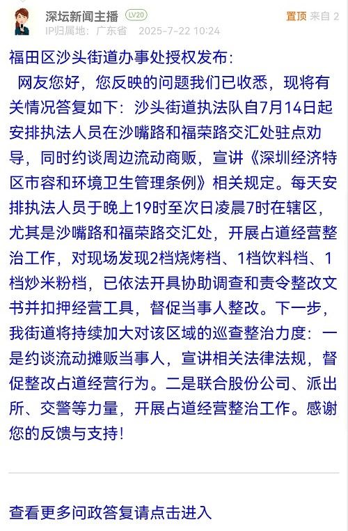 網(wǎng)友您好,您反映的問題我們已收悉,現(xiàn)將有關(guān)情況答復如下:沙頭街道執(zhí)法隊自7月14日起安排執(zhí)法人員在沙嘴路和福榮路交匯處駐點勸導,同時約談周邊流動商販,宣講《深圳經(jīng)濟特區(qū)市容和環(huán)境衛(wèi)生管理條例》相關(guān)規(guī)定。每天安排執(zhí)法人員于晚上19時至次日凌晨7時在轄區(qū),尤其是沙嘴路和福榮路交匯處,開展占道經(jīng)營整治工作,對現(xiàn)場發(fā)現(xiàn)2檔燒烤檔、1檔飲料檔、1檔炒米粉檔,已依法開具協(xié)助調(diào)查和責令整改文書并扣押經(jīng)營工具,督促當事人整改。下一步,我街道將持續(xù)加大對該區(qū)域的巡查整治力度:一是約談流動攤販當事人,宣講相關(guān)法律法規(guī),督促整改占道經(jīng)營行為。二是聯(lián)合股份公司、派出所、交警等力量,開展占道經(jīng)營整治工作。感謝您的反饋與支持!