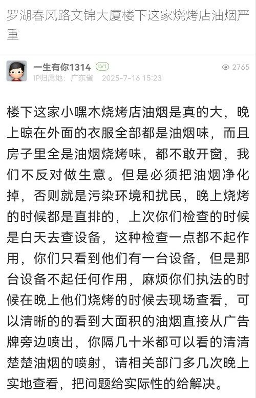 33. 帖文《羅湖春風路文錦大廈樓下這家燒烤店油煙嚴重》