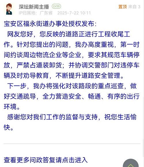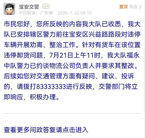 市民您好,您所反映的內(nèi)容我大隊已收悉,我大隊已安排轄區(qū)警力前往寶安區(qū)興益路路段對違停車輛開展勸離、整治工作。針對有貨車在該位置違停卸貨問題,7月21日上午11時,我大隊福永中隊警力已約談物流公司負責人并要求其整改。后續(xù)如您對交通管理方面有疑問、建議、投訴的,請撥打83333333進行反映,交警部門將立即響應,積極辦理。