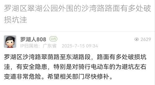 7. 帖文《羅湖區(qū)翠湖公園外圍的沙灣路路面有多處破損坑洼》