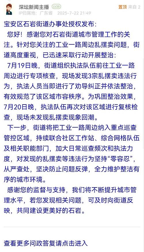 您好!感謝您對石巖街道城市管理工作的關(guān)注。針對您關(guān)注的工業(yè)一路周邊亂擺賣問題,街道高度重視,已迅速采取行動開展整治: