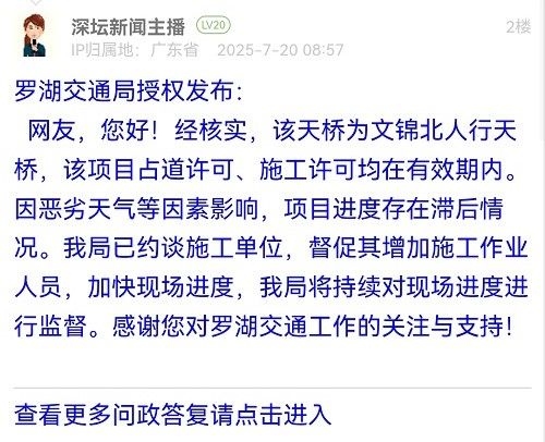 網(wǎng)友,您好!經(jīng)核實,該天橋為文錦北人行天橋,該項目占道許可、施工許可均在有效期內(nèi)。因惡劣天氣等因素影響,項目進度存在滯后情況。我局已約談施工單位,督促其增加施工作業(yè)人員,加快現(xiàn)場進度,我局將持續(xù)對現(xiàn)場進度進行監(jiān)督。感謝您對羅湖交通工作的關(guān)注與支持!