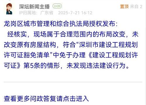 經(jīng)核實,現(xiàn)場屬于合理范圍內(nèi)的布局改變,未改變原有房屋結(jié)構(gòu),符合“深圳市建設工程規(guī)劃許可證豁免清單”中免于辦理《建設工程規(guī)劃許可證》第5條的情形,未發(fā)現(xiàn)違法建設行為。
