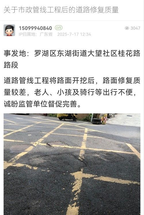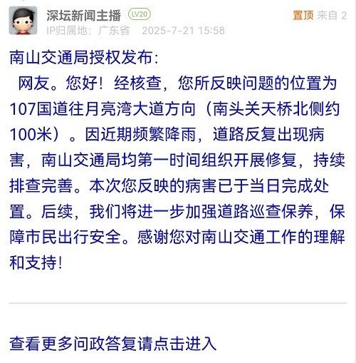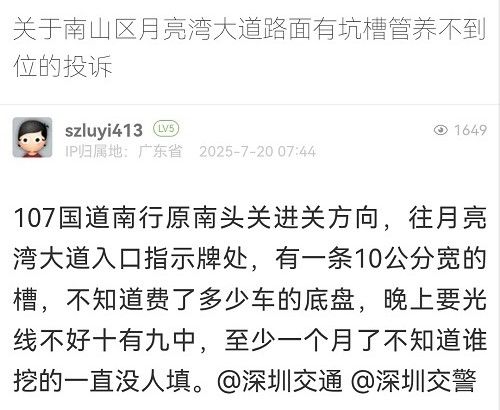 31. 帖文《關(guān)于南山區(qū)月亮灣大道路面有坑槽管養(yǎng)不到位的投訴》