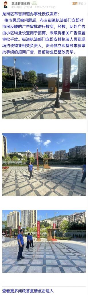 接市民反映問題后,布吉街道執(zhí)法部門立即對市民反映的廣告審批進行核實,經(jīng)核,此處廣告由小區(qū)物業(yè)設置用于招商,未取得相關(guān)廣告設置審批手續(xù)。街道執(zhí)法部門立即安排執(zhí)法人員到現(xiàn)場約談物業(yè)相關(guān)負責人,責令其立即整改未獲審批手續(xù)的招商廣告,目前物業(yè)已整改完畢。