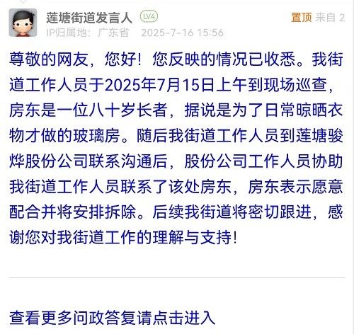 尊敬的網(wǎng)友,您好!您反映的情況已收悉。我街道工作人員于2025年7月15日上午到現(xiàn)場巡查,房東是一位八十歲長者,據(jù)說是為了日常晾曬衣物才做的玻璃房。隨后我街道工作人員到蓮塘駿燁股份公司聯(lián)系溝通后,股份公司工作人員協(xié)助我街道工作人員聯(lián)系了該處房東,房東表示愿意配合并將安排拆除。后續(xù)我街道將密切跟進,感謝您對我街道工作的理解與支持!