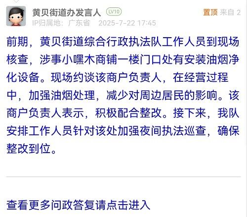 前期,黃貝街道綜合行政執(zhí)法隊工作人員到現(xiàn)場核查,涉事小嘿木商鋪一樓門口處有安裝油煙凈化設備?,F(xiàn)場約談該商戶負責人,在經(jīng)營過程中,加強油煙處理,減少對周邊居民的影響。該商戶負責人表示,積極配合整改。接下來,我隊安排工作人員針對該處加強夜間執(zhí)法巡查,確保整改到位。
