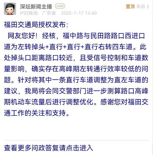 網(wǎng)友您好!經(jīng)核,福中路與民田路路口西進口道為左轉(zhuǎn)掉頭+直行+直行+直行右轉(zhuǎn)四車道。此處掉頭口距離路口較近,且受信號控制和車道數(shù)量影響,確實存在高峰期左轉(zhuǎn)通行效率較低的問題。針對將其中一條直行車道調(diào)整為直左車道的建議,我局將會同交警部門進一步測算路口高峰期機動車流量后進行調(diào)整優(yōu)化。感謝您對福田交通工作的關(guān)注和支持。