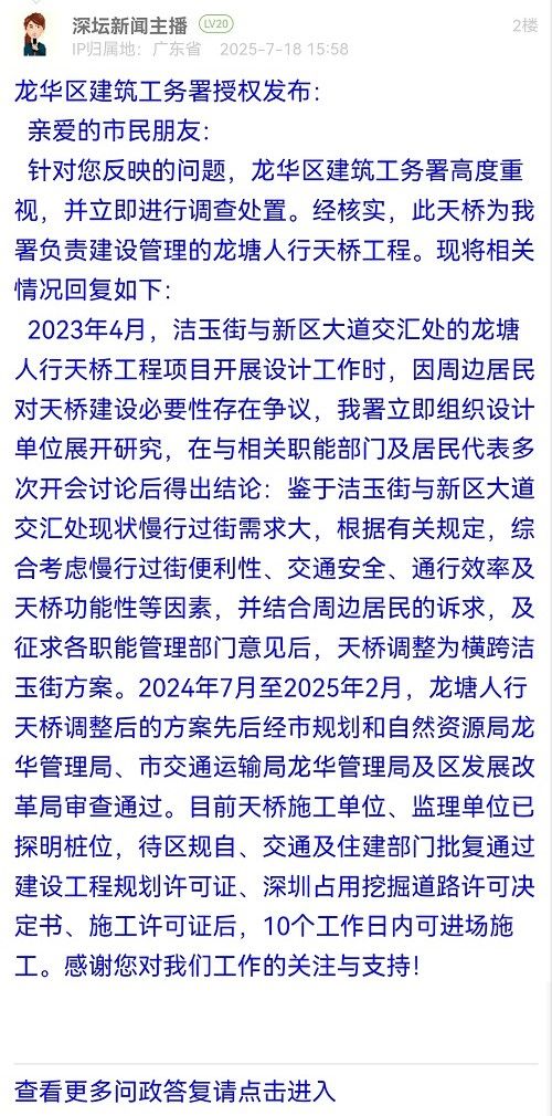 2023年4月,潔玉街與新區(qū)大道交匯處的龍?zhí)寥诵刑鞓蚬こ添椖块_展設計工作時,因周邊居民對天橋建設必要性存在爭議,我署立即組織設計單位展開研究,在與相關(guān)職能部門及居民代表多次開會討論后得出結(jié)論:鑒于潔玉街與新區(qū)大道交匯處現(xiàn)狀慢行過街需求大,根據(jù)有關(guān)規(guī)定,綜合考慮慢行過街便利性、交通安全、通行效率及天橋功能性等因素,并結(jié)合周邊居民的訴求,及征求各職能管理部門意見后,天橋調(diào)整為橫跨潔玉街方案。2024年7月至2025年2月,龍?zhí)寥诵刑鞓蛘{(diào)整后的方案先后經(jīng)市規(guī)劃和自然資源局龍華管理局、市交通運輸局龍華管理局及區(qū)發(fā)展改革局審查通過。目前天橋施工單位、監(jiān)理單位已探明樁位,待區(qū)規(guī)自、交通及住建部門批復通過建設工程規(guī)劃許可證、深圳占用挖掘道路許可決定書、施工許可證后,10個工作日內(nèi)可進場施工。感謝您對我們工作的關(guān)注與支持!