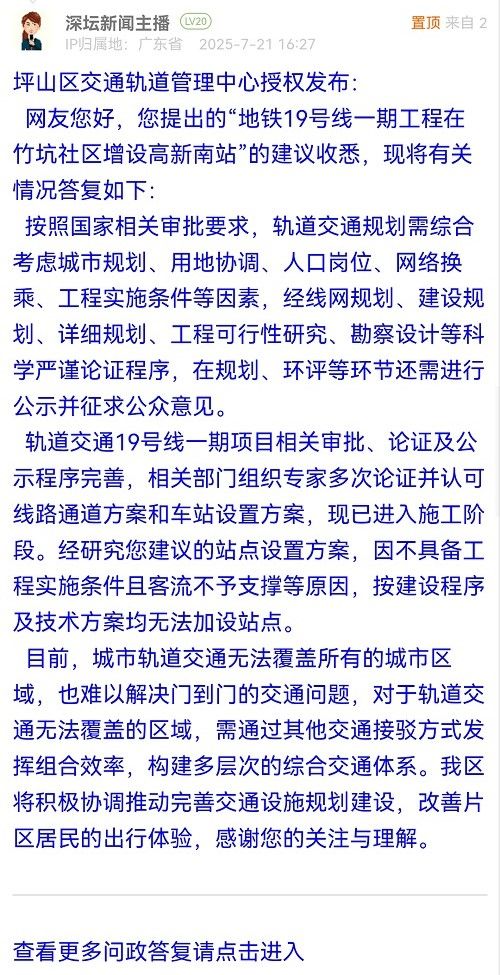 網(wǎng)友您好,您提出的“地鐵19號線一期工程在竹坑社區(qū)增設高新南站”的建議收悉,現(xiàn)將有關(guān)情況答復如下: