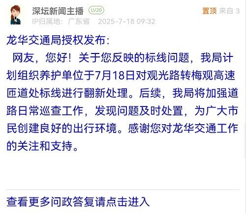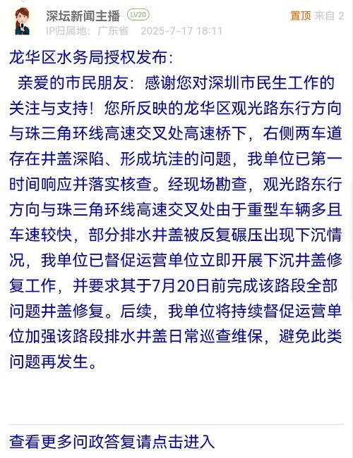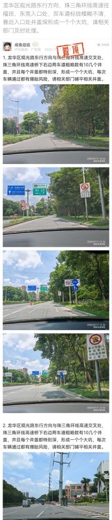 15. 帖文《龍華區(qū)觀光路東行方向,珠三角環(huán)線高速往福田、東莞入口處,雙車道標線模糊不清,靠近入口處井蓋深形成一個個大坑,請相關(guān)部門及時處理。》