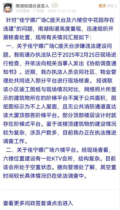 針對“佳寧娜廣場C座天臺及六樓空中花園存在違建”的問題,南湖街道高度重視,迅速組織開展核查處置,現(xiàn)將有關(guān)情況匯報如下: