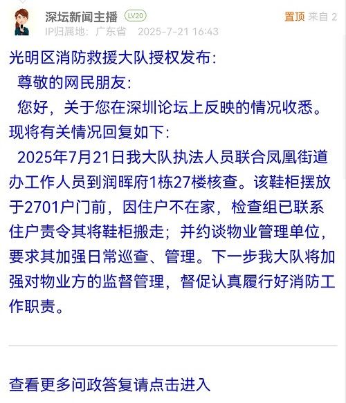 2025年7月21日我大隊執(zhí)法人員聯(lián)合鳳凰街道辦工作人員到潤暉府1棟27樓核查。該鞋柜擺放于2701戶門前,因住戶不在家,檢查組已聯(lián)系住戶責令其將鞋柜搬走;并約談物業(yè)管理單位,要求其加強日常巡查、管理。下一步我大隊將加強對物業(yè)方的監(jiān)督管理,督促認真履行好消防工作職責。