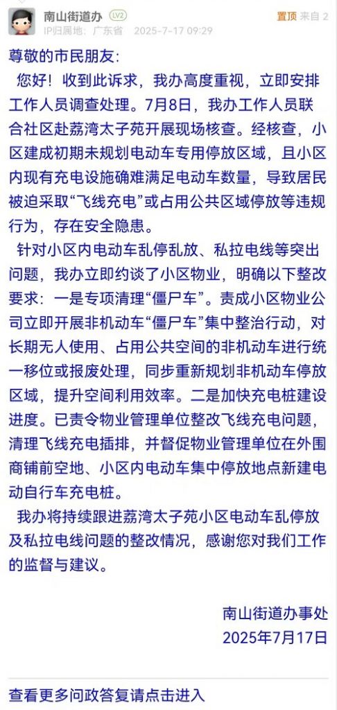 我辦將持續(xù)跟進荔灣太子苑小區(qū)電動車亂停放及私拉電線問題的整改情況,感謝您對我們工作的監(jiān)督與建議。