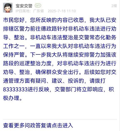 市民您好,您所反映的內(nèi)容已收悉,我大隊已安排轄區(qū)警力前往德政路針對非機動車違法進行勸導、整治。非機動車違法整治是交警常態(tài)化勤務工作之一,一直以來我大隊對非機動車違法行為保持嚴管。下一步我大隊將繼續(xù)安排警力加強該路段的巡邏整治力度,對非機動車違法行為進行勸導、整治,確保群眾安全出行。后續(xù)如您對交通管理方面有疑問、建議、投訴的,請撥打83333333進行反映,交警部門將立即響應,積極辦理。