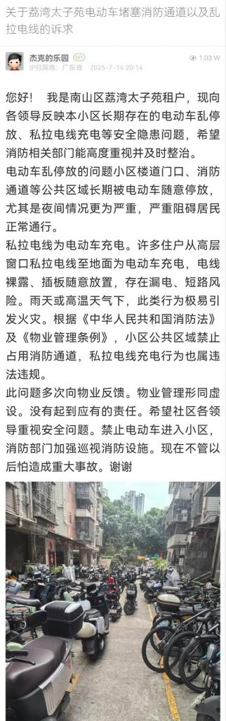 5. 帖文《關(guān)于荔灣太子苑電動車堵塞消防通道以及亂拉電線的訴求》