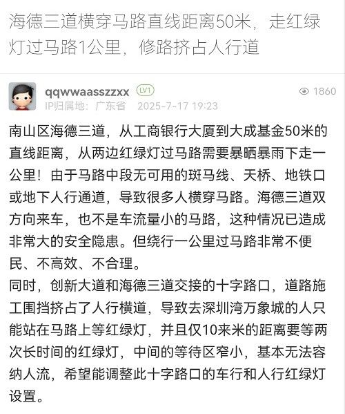 18. 帖文《海德三道橫穿馬路直線距離50米,走紅綠燈過馬路1公里,修路擠占人行道》