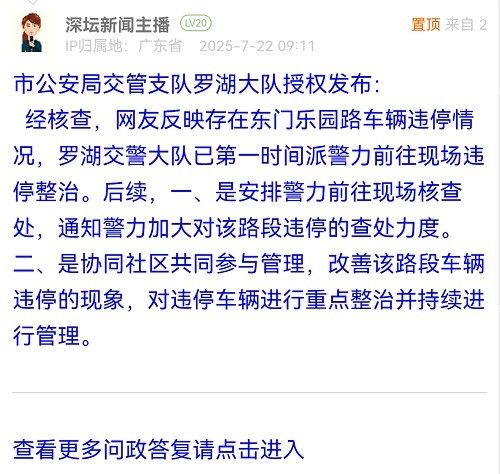 經(jīng)核查,網(wǎng)友反映存在東門樂園路車輛違停情況,羅湖交警大隊已第一時間派警力前往現(xiàn)場違停整治。后續(xù),一、是安排警力前往現(xiàn)場核查處,通知警力加大對該路段違停的查處力度。二、是協(xié)同社區(qū)共同參與管理,改善該路段車輛違停的現(xiàn)象,對違停車輛進行重點整治并持續(xù)進行管理。