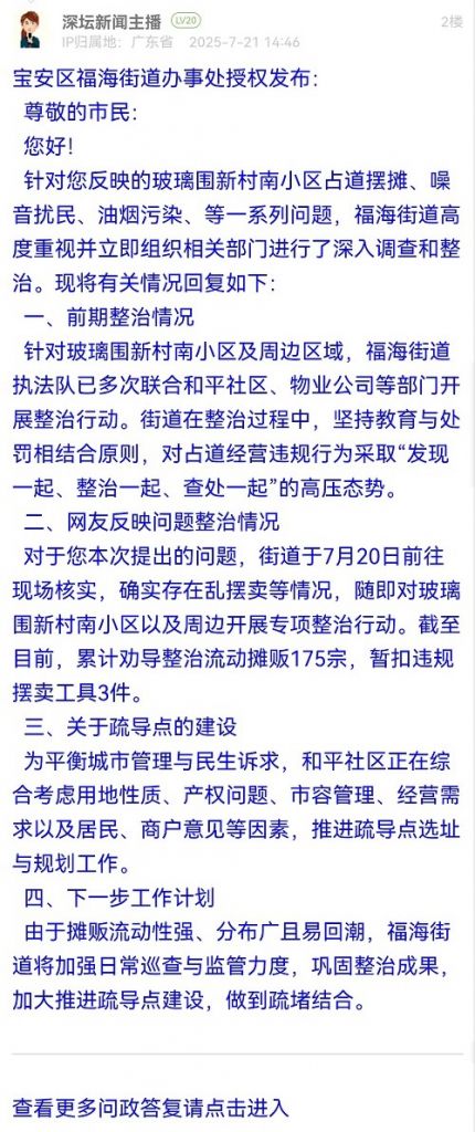 對于您本次提出的問題,街道于7月20日前往現(xiàn)場核實,確實存在亂擺賣等情況,隨即對玻璃圍新村南小區(qū)以及周邊開展專項整治行動。截至目前,累計勸導整治流動攤販175宗,暫扣違規(guī)擺賣工具3件。