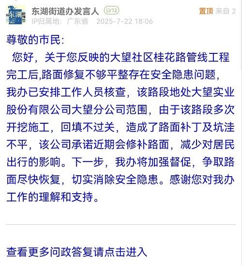 您好,關(guān)于您反映的大望社區(qū)桂花路管線工程完工后,路面修復不夠平整存在安全隱患問題,我辦已安排工作人員核查,該路段地處大望實業(yè)股份有限公司大望分公司范圍,由于該路段多次開挖施工,回填不過關(guān),造成了路面補丁及坑洼不平,該公司承諾近期會修補路面,減少對居民出行的影響。下一步,我辦將加強督促,爭取路面盡快恢復,切實消除安全隱患。感謝您對我辦工作的理解和支持。