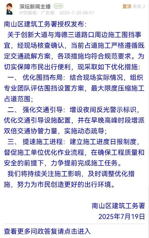 關(guān)于創(chuàng)新大道與海德三道路口周邊施工圍擋事宜,經(jīng)現(xiàn)場核查確認,當前占道施工嚴格遵循既定交通疏解方案,各項措施均符合規(guī)范要求。為切實保障市民出行便利,現(xiàn)采取如下優(yōu)化措施: