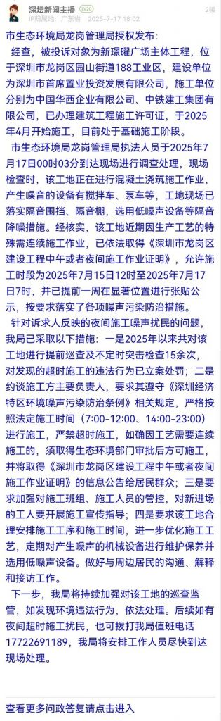 針對訴求人反映的夜間施工噪聲擾民的問題,我局已采取以下措施:一是2025年以來共對該工地進行提前巡查及不定時突擊檢查15余次,對發(fā)現(xiàn)的超時施工的違法行為已立案處罰;二是約談施工方主要負責人,要求其遵守《深圳經(jīng)濟特區(qū)環(huán)境噪聲污染防治條例》相關(guān)規(guī)定,嚴格按照法定施工時間(7:00-12:00、14:00-23:00)進行施工,嚴禁超時施工,如確因工藝需要連續(xù)施工的,須取得生態(tài)環(huán)境部門審批后方可施工,并將取得《深圳市龍崗區(qū)建設工程中午或者夜間施工作業(yè)證明》的信息公告給居民群眾;三是要求加強對施工班組、施工人員的管控,對新進場的工人要開展施工宣傳指導;四是要求該工地合理安排施工工序和施工時間,進一步優(yōu)化施工工藝,定期對產(chǎn)生噪聲的機械設備進行維護保養(yǎng)并選用低噪聲設備。做好與周邊居民的溝通、解釋和接訪工作。
