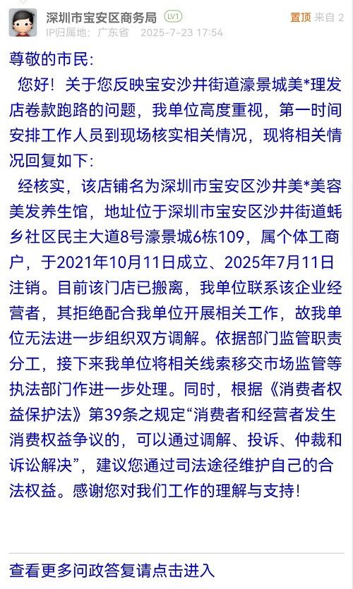 您好!關(guān)于您反映寶安沙井街道濠景城美*理發(fā)店卷款跑路的問題,我單位高度重視,第一時間安排工作人員到現(xiàn)場核實相關(guān)情況,現(xiàn)將相關(guān)情況回復如下: