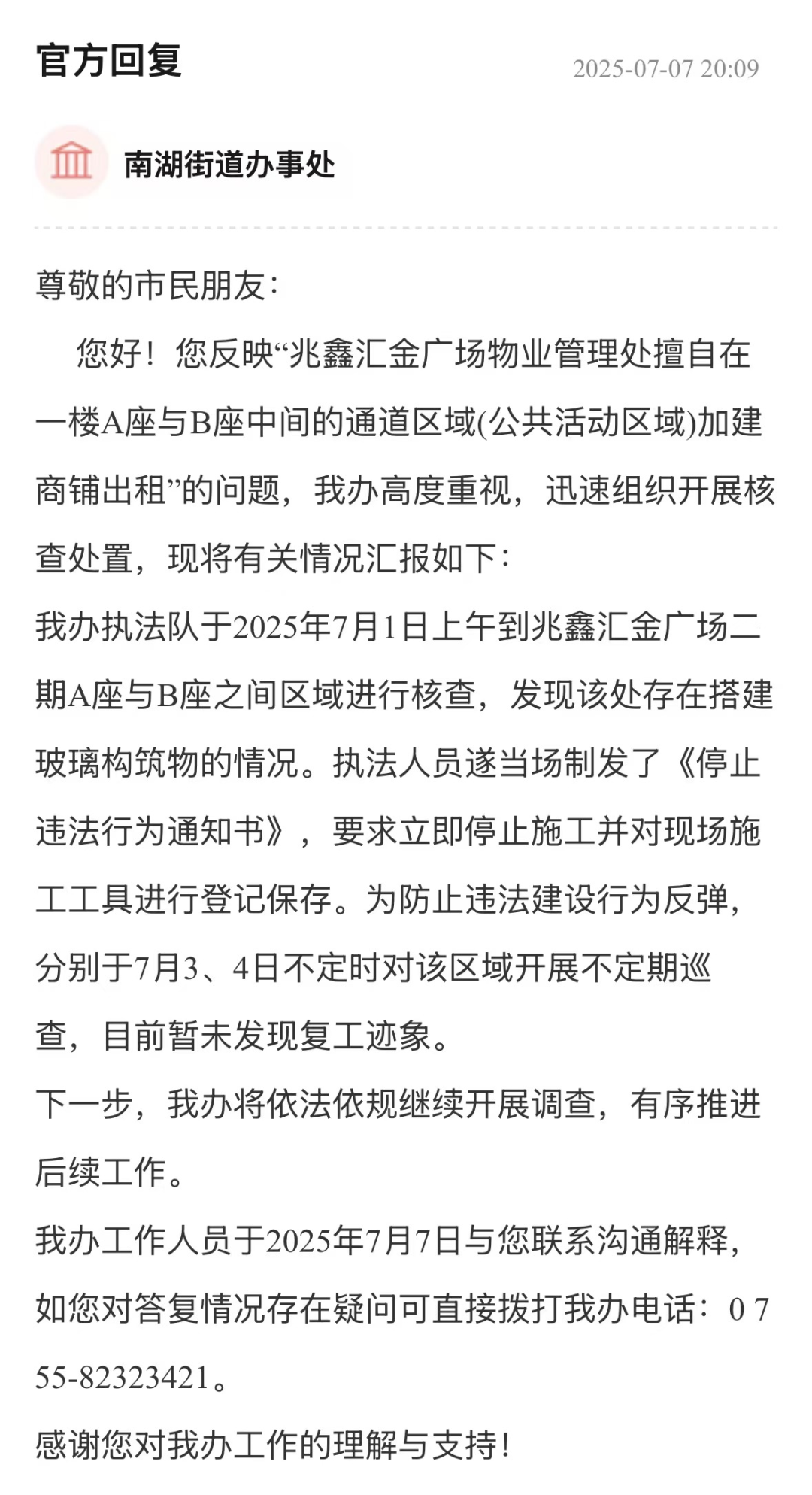 從市民反饋到執(zhí)法處置,羅湖區(qū)南湖街道辦事處以快速響應(yīng)、精準(zhǔn)執(zhí)法展現(xiàn)治理效能。通過現(xiàn)場(chǎng)核查、制發(fā)《停止違法行為通知書》、登記保存施工工具等措施,及時(shí)遏制違法搭建勢(shì)頭,并建立不定期巡查機(jī)制防止反彈。從“即時(shí)制止”到“長效監(jiān)督”的閉環(huán)管理,維護(hù)了業(yè)主合法權(quán)益與消防通道安全,為城市違建治理提供了高效務(wù)實(shí)的實(shí)踐樣本,彰顯基層執(zhí)法部門守護(hù)民生安全的責(zé)任擔(dān)當(dāng)。