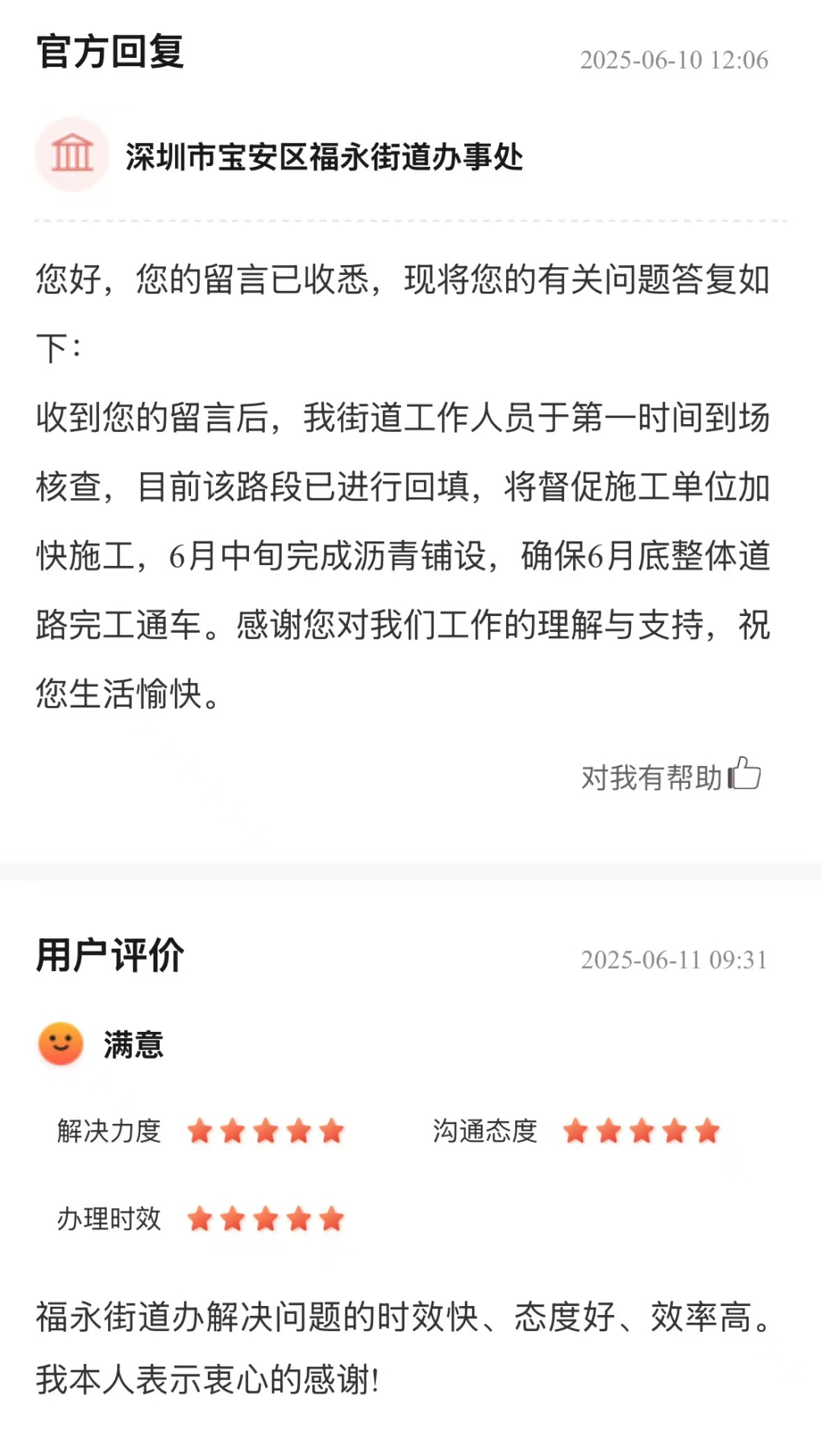 案例點(diǎn)評(píng):道路銜接處的大坑大坎影響通行安全與道路順暢,亟待解決。街道辦收到留言后迅速行動(dòng),第一時(shí)間到場(chǎng)核查,明確將督促施工單位加快進(jìn)度,在預(yù)計(jì)時(shí)間內(nèi)完成瀝青鋪設(shè)及道路整體完工,這些舉措體現(xiàn)了對(duì)道路通行問題的重視和高效的處理能力,為保障道路正常通行提供了有力保障,獲得了市民的滿意評(píng)價(jià)。