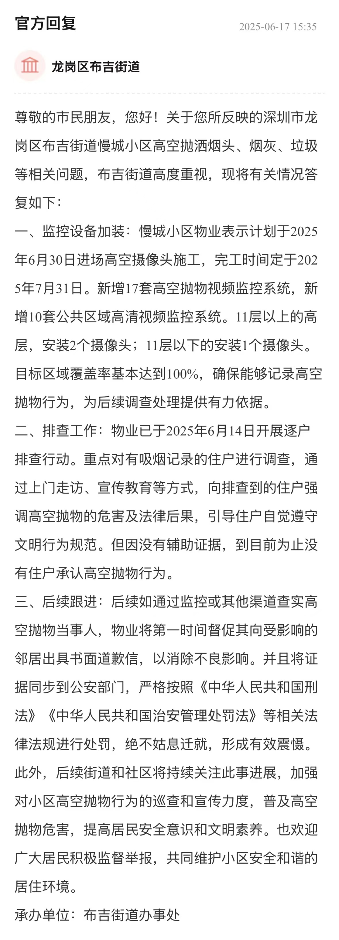 高空拋物嚴(yán)重威脅居民人身與財(cái)產(chǎn)安全,需嚴(yán)肅對(duì)待。街道辦接到相關(guān)反映后,積極推動(dòng)物業(yè)規(guī)劃加裝視頻監(jiān)控系統(tǒng),明確了施工和完工時(shí)間,同時(shí)安排物業(yè)開展逐戶排查,重點(diǎn)調(diào)查有吸煙記錄住戶,體現(xiàn)出對(duì)問題的重視和解決問題的行動(dòng)力。在后續(xù)保障方面,明確查實(shí)拋物當(dāng)事人后將督促其道歉并交由公安部門依規(guī)處罰,街道和社區(qū)也將持續(xù)關(guān)注、加強(qiáng)巡查與宣傳,為維護(hù)小區(qū)安全提供了有力支持。