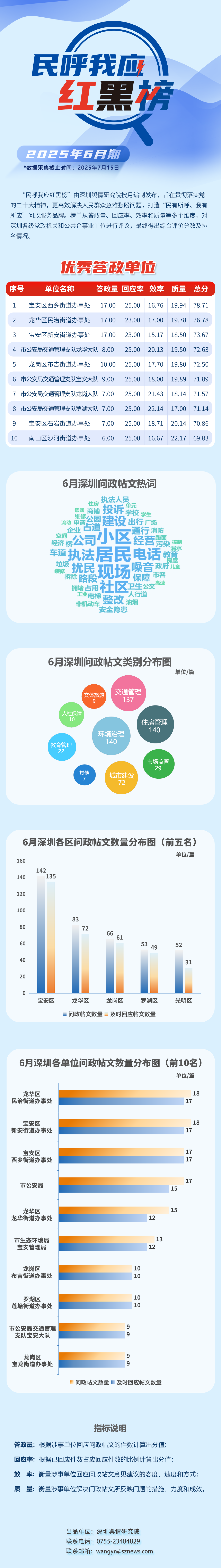 本期榜單采集的帖文主要來自深圳市及各區(qū)政府官網(wǎng)、深圳論壇、人民網(wǎng)領(lǐng)導(dǎo)留言板、深圳新聞網(wǎng)“民呼我應(yīng)”等平臺(tái),所采集帖文發(fā)布時(shí)間為2025年6月1日至6月30日,采集截止時(shí)間為2025年7月15日。