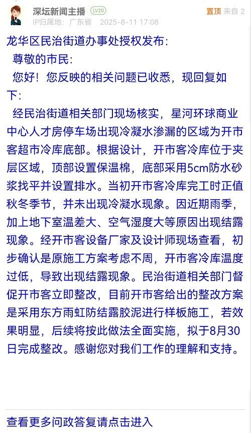 經(jīng)民治街道相關(guān)部門現(xiàn)場核實,星河環(huán)球商業(yè)中心人才房停車場出現(xiàn)冷凝水滲漏的區(qū)域為開市客超市冷庫底部。根據(jù)設(shè)計,開市客冷庫位于夾層區(qū)域,頂部設(shè)置保溫棉,底部采用5cm防水砂漿找平并設(shè)置排水。當(dāng)初開市客冷庫完工時正值秋冬季節(jié),并未出現(xiàn)冷凝水現(xiàn)象。因近期雨季,加上地下室溫差大、空氣濕度大等原因出現(xiàn)結(jié)露現(xiàn)象。經(jīng)開市客設(shè)備廠家及設(shè)計師現(xiàn)場查看,初步確認(rèn)是原施工方案考慮不周,開市客冷庫溫度過低,導(dǎo)致出現(xiàn)結(jié)露現(xiàn)象。民治街道相關(guān)部門督促開市客立即整改,目前開市客給出的整改方案是采用東方雨虹防結(jié)露膠泥進行樣板施工,若效果明顯,后續(xù)將按此做法全面實施,擬于8月30日完成整改。感謝您對我們工作的理解和支持。