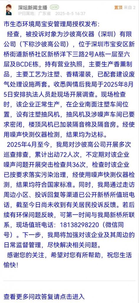 經(jīng)查,被投訴對象為沙彼高儀器(深圳)有限公司(下稱沙彼高公司),位于深圳市寶安區(qū)新橋街道新橋社區(qū)新橋洋下三路2號A棟一層至六層及BCDE棟,持有營業(yè)執(zhí)照,主要生產(chǎn)香薰制品,主要工藝為注塑、香精灌裝,已配套建設(shè)廢氣處理設(shè)施兩套。收悉輿情后我局于2025年8月5日安排執(zhí)法人員赴現(xiàn)場開展調(diào)查?,F(xiàn)場檢查時,該企業(yè)正常生產(chǎn),在企業(yè)南面注塑車間位置,設(shè)有注塑抽風(fēng)機,抽風(fēng)機及涉噪聲車間已要求密閉,樓頂風(fēng)機已加裝隔音棉及隔音房。經(jīng)使用噪聲快測儀器檢測,結(jié)果均為達標(biāo)。
