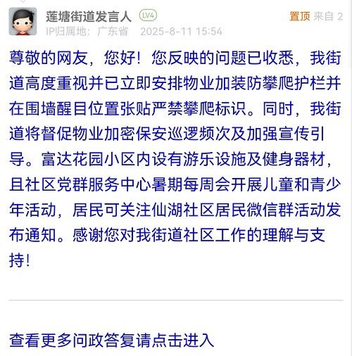尊敬的網(wǎng)友,您好!您反映的問題已收悉,我街道高度重視并已立即安排物業(yè)加裝防攀爬護欄并在圍墻醒目位置張貼嚴(yán)禁攀爬標(biāo)識。同時,我街道將督促物業(yè)加密保安巡邏頻次及加強宣傳引導(dǎo)。富達花園小區(qū)內(nèi)設(shè)有游樂設(shè)施及健身器材,且社區(qū)黨群服務(wù)中心暑期每周會開展兒童和青少年活動,居民可關(guān)注仙湖社區(qū)居民微信群活動發(fā)布通知。感謝您對我街道社區(qū)工作的理解與支持!