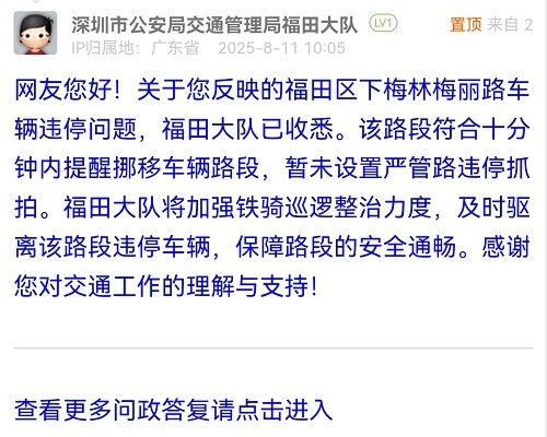 網(wǎng)友您好!關(guān)于您反映的福田區(qū)下梅林梅麗路車輛違停問題,福田大隊已收悉。該路段符合十分鐘內(nèi)提醒挪移車輛路段,暫未設(shè)置嚴(yán)管路違停抓拍。福田大隊將加強鐵騎巡邏整治力度,及時驅(qū)離該路段違停車輛,保障路段的安全通暢。感謝您對交通工作的理解與支持!