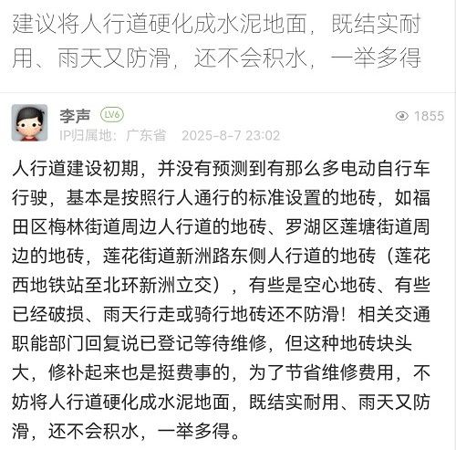 網(wǎng)友,您好!近年來,我們已對轄區(qū)內(nèi)部分電動自行車通行量較大的道路,試點采用拉絲混凝土工藝進行維修改造。下一步將結(jié)合年度養(yǎng)護計劃逐步推廣建設(shè)。感謝您的寶貴建議!