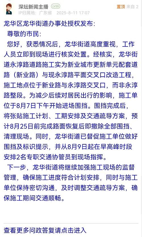 您好,獲悉情況后,龍華街道高度重視,工作人員立即到現(xiàn)場進行核實處置。經(jīng)核實,龍華街道永淳路道路施工實為新業(yè)城市更新單元配套道路(新業(yè)路)與現(xiàn)永淳路平面交叉口改造工程,施工地點位于新業(yè)路與永淳路交叉口,而非永淳路整段。為減少后續(xù)對居民出行的影響,施工單位于8月7日下午開始進場圍擋。圍擋完成后,將張貼施工計劃、工期安排及交通疏導(dǎo)方案,預(yù)計8月25日前完成路面恢復(fù)后即撤除全部圍擋、清理現(xiàn)場。同時,龍華街道已督促施工單位做好圍擋及標(biāo)識提示,并從8月9日起在早高峰時段安排2名專職交通協(xié)管員到現(xiàn)場指揮。