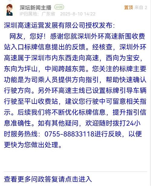 網(wǎng)友,您好!感謝您就深圳外環(huán)高速新圍收費站入口標(biāo)牌信息提出的反饋。經(jīng)核查,深圳外環(huán)高速屬于深圳市內(nèi)東西走向高速,西向為寶安,東向為坪山,中間跨越東莞。您關(guān)注的標(biāo)牌主要功能是為司乘人員提供方向指引,幫助快速確認(rèn)行駛方向。另外環(huán)高速主線已設(shè)置標(biāo)牌引導(dǎo)車輛行駛至平山收費站,建議您行駛中可留意相關(guān)指示。后續(xù)我們將不斷優(yōu)化標(biāo)牌信息,提升指引信息準(zhǔn)確性。如有其他疑問,歡迎隨時撥打24小時服務(wù)熱線:0755-88833118進行反映,以便更快為您做出處理。