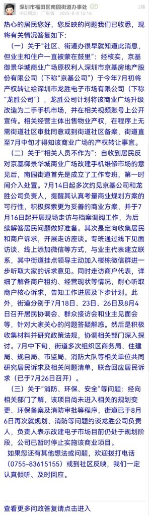 (二)關(guān)于“相關(guān)人員不作為”:自收到居民反對京基御景華城商業(yè)廣場改建手機維修市場的意見后,南園街道首先是成立了工作專班,第一時間介入處置。7月14日起多次約見京基公司和龍勝公司負(fù)責(zé)人,提醒其認(rèn)真考量商業(yè)規(guī)劃方案的可行性,積極探索更為妥善的商業(yè)方案,并于7月16日起開展現(xiàn)場走訪與檔案調(diào)閱工作,為后續(xù)解答居民問題做好準(zhǔn)備。其次是定向收集居民和商戶訴求,開展走訪座談。專班通過線下見面訪談、線上添加微信等方式,與業(yè)主代表建立聯(lián)系,其中街道掛點領(lǐng)導(dǎo)主動加入樓棟微信群進一步聽取大家的訴求意見。同時走訪商戶代表,詳細了解各商戶租約、經(jīng)營現(xiàn)狀等情況,耐心聽取商戶核心訴求,告知工作進展及下步計劃。此外,街道分別于7月18日、23日、26日及8月4日召開居民協(xié)調(diào)會、群眾接訪會和業(yè)主見面會等,針對大家關(guān)心的問題答疑解惑。然后是積極收集材料并研究政策法規(guī),協(xié)調(diào)相關(guān)部門深入探討。7月中下旬,街道多次組織區(qū)商務(wù)局、住建局、規(guī)自局、市監(jiān)局、消防大隊等相關(guān)單位共同研究居民訴求及相關(guān)問題清單,聯(lián)合回應(yīng)居民訴求(已于7月26日召開)。