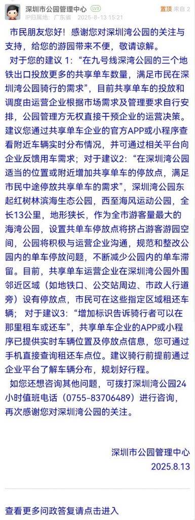 對于您的建議 1:“在九號線深灣公園的三個地鐵出口投放更多的共享單車數(shù)量,滿足市民在深圳灣公園騎行的需求”,目前共享單車的投放和調(diào)度由運營企業(yè)根據(jù)市場需求及管理要求自行安排,公園管理方無權(quán)直接干預(yù)企業(yè)的運營決策。建議您通過共享單車企業(yè)的官方APP或小程序查看附近車輛實時分布情況,并可通過相關(guān)平臺向企業(yè)反饋用車需求;對于建議2:“在深圳灣公園適當(dāng)?shù)奈恢没蚋浇黾庸蚕韱诬嚨耐7劈c,滿足市民中途停放共享單車的需求”,深圳灣公園東起紅樹林濱海生態(tài)公園,西至海風(fēng)運動公園,全長13公里,地形狹長,作為全市游客量最大的海灣公園,設(shè)置共單車停放點將擠占游客游園空間,公園將積極與運營企業(yè)溝通,規(guī)范和整改公園內(nèi)的單車停放問題,不斷減少公園內(nèi)的單車滯留。目前,共享單車運營企業(yè)在深圳灣公園外圍鄰近區(qū)域(如地鐵口、公交站周邊、市政人行道旁)設(shè)有停放點,市民可在這些指定區(qū)域租還車輛; 對于建議3:“增加標(biāo)識告訴騎行者可以在那里租車或還車”,共享單車企業(yè)的APP或小程序已提供實時車輛位置及停放點信息,您可通過手機直接查詢租還車點位。建議騎行前提前通過企業(yè)平臺了解車輛分布,規(guī)劃好行程。